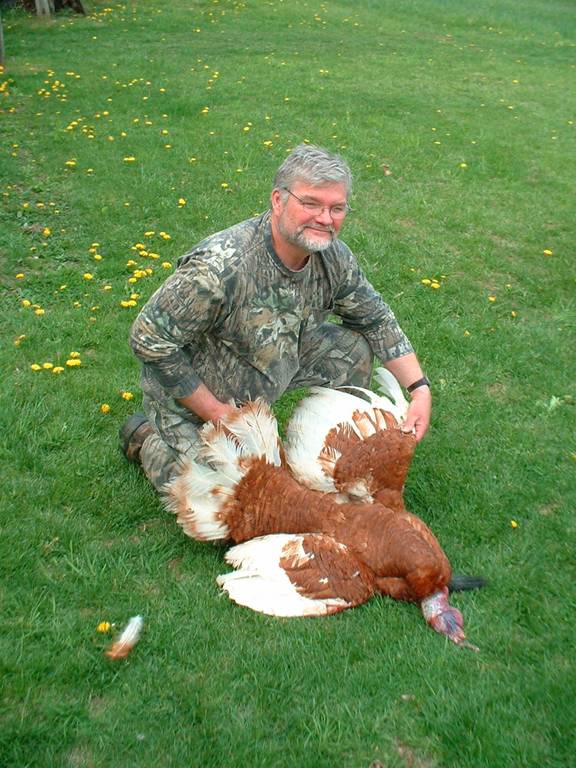 I thought your readers would be interested in the unusual spring gobbler I took this year. For me, it was a turkey of a lifetime. While hunting in Pennsylvania State Game Lands 73 on May 5, 2007, I shot an erythritic (red) adult gobbler. As you can see in the photo, the wing and tail feathers were white and the rest of the bird was red. The bird weighed in at 24 pounds and had two beards; a seven inch and a one inch. It only had one spur that was 7/8 inch. Dan White |